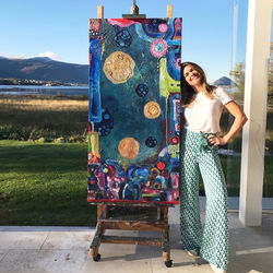 Her expression is mainly abstract, with the use of acrylic/mixed media and some mixed art/printed media on canvas. In her paintings, she likes to ad different types of material, such as sand, gold leaf, trowel, pearls and sparkling objects. She has a mild crush on the darker color of blue, which you will observe from several of her paintings. She likes to vary her expression, from the colorful and lively, to the opposite that is darker and more reflective.